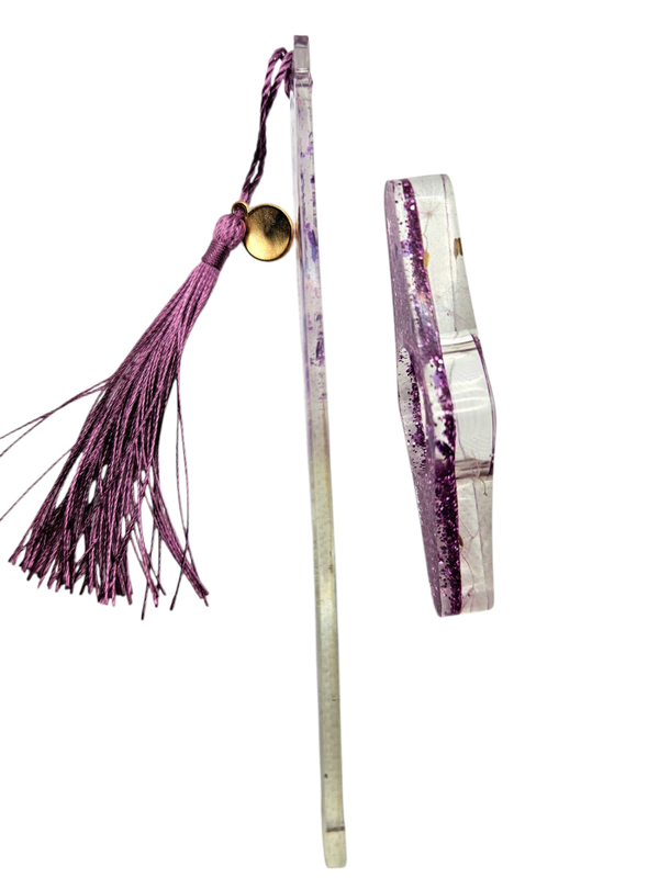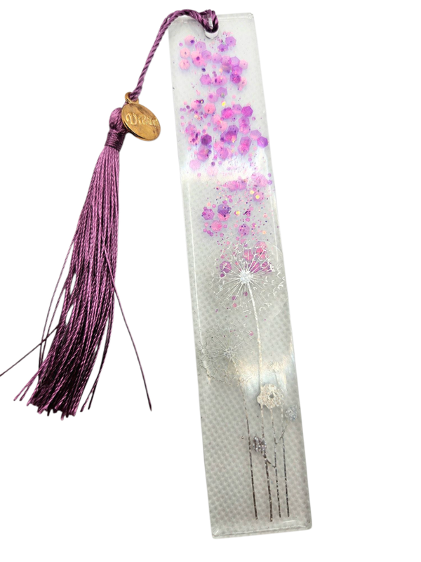 -marque-page transparent avec paillettes holographiques rose et motif fleurs de pissenlits.