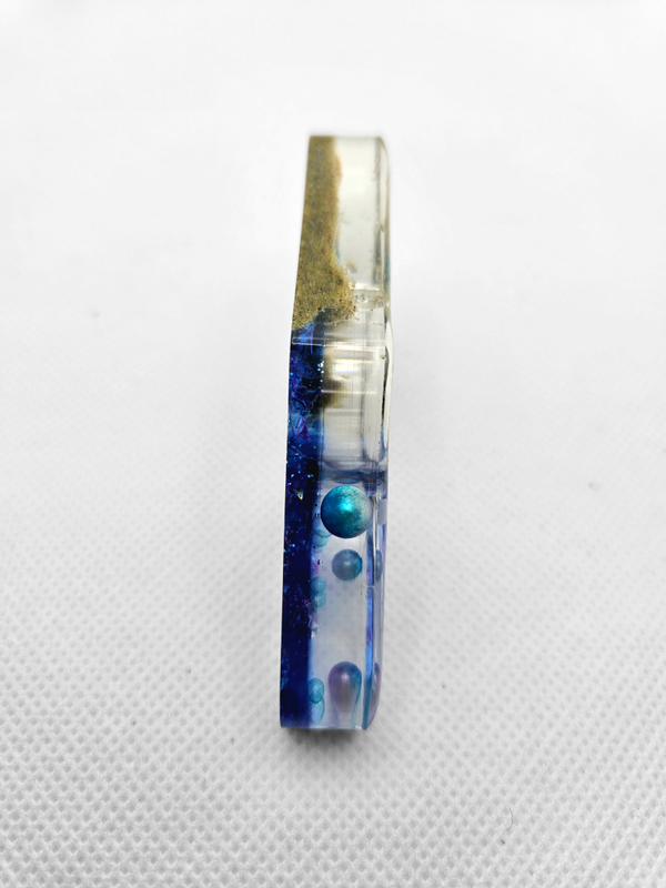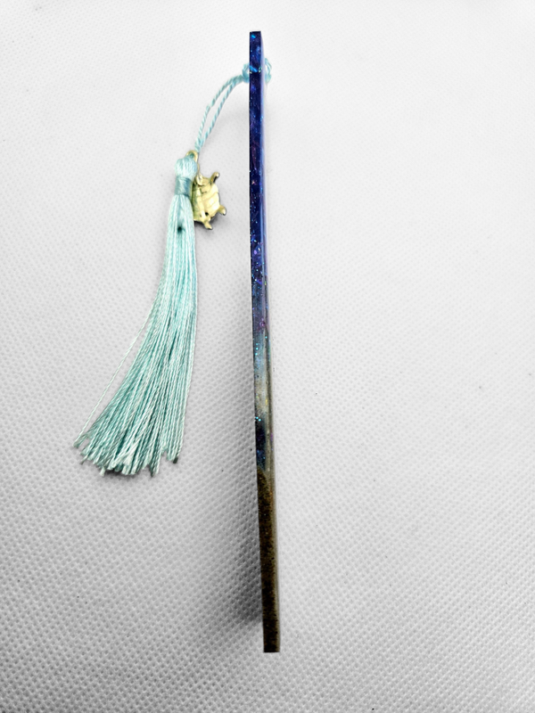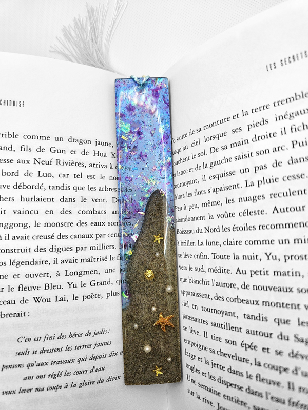 -marque-page bleu holographique, avec sable, perle et bijoux coquillages.