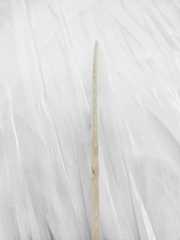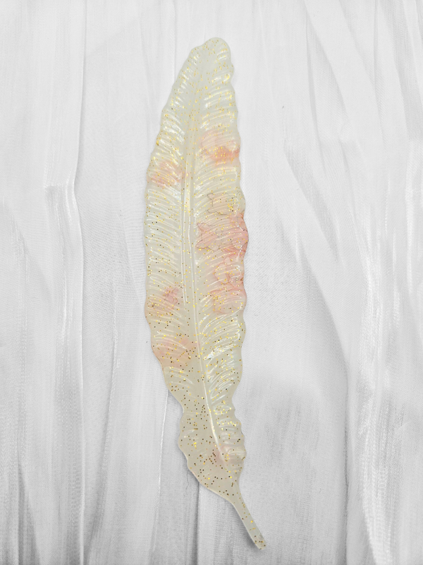 Marque-page plume d'automne, fond blanc et paillettes dorées.