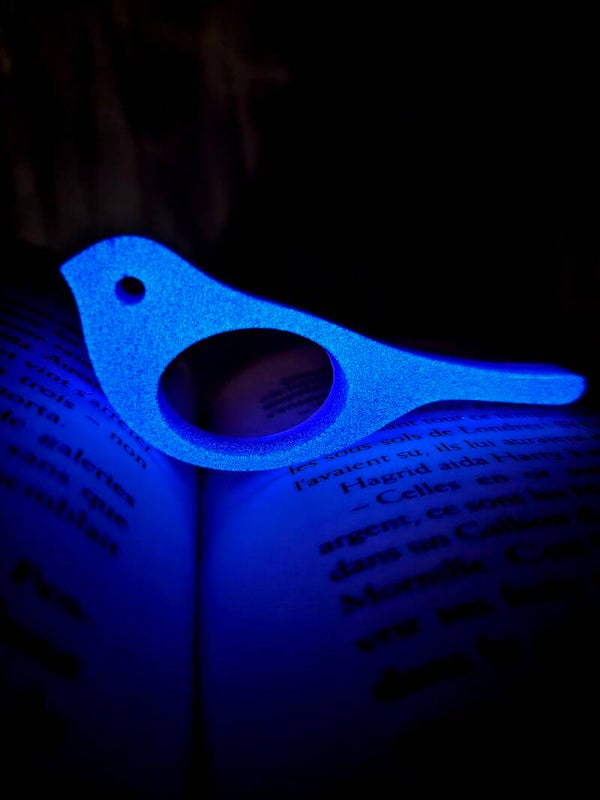 Il suffit que le marque-page et la bague soit à la lumière dans la journée (du jour ou électrique), ou une minute sous lampe UV pour briller d'une jolie couleur bleue.