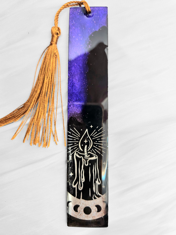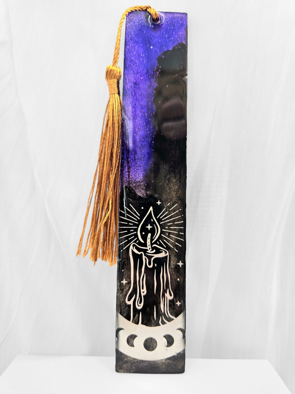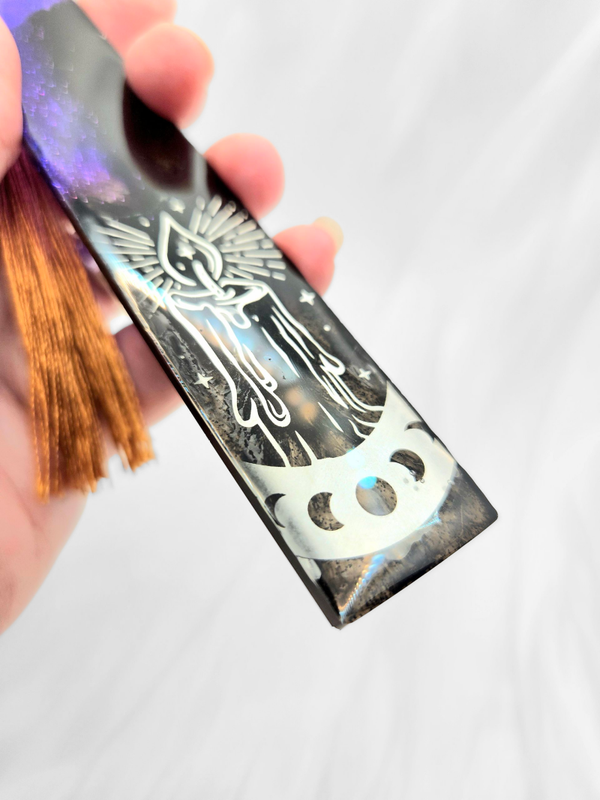 violet/noir pailleté avec effet de fumée, motif holographique bougies, phases de lune.